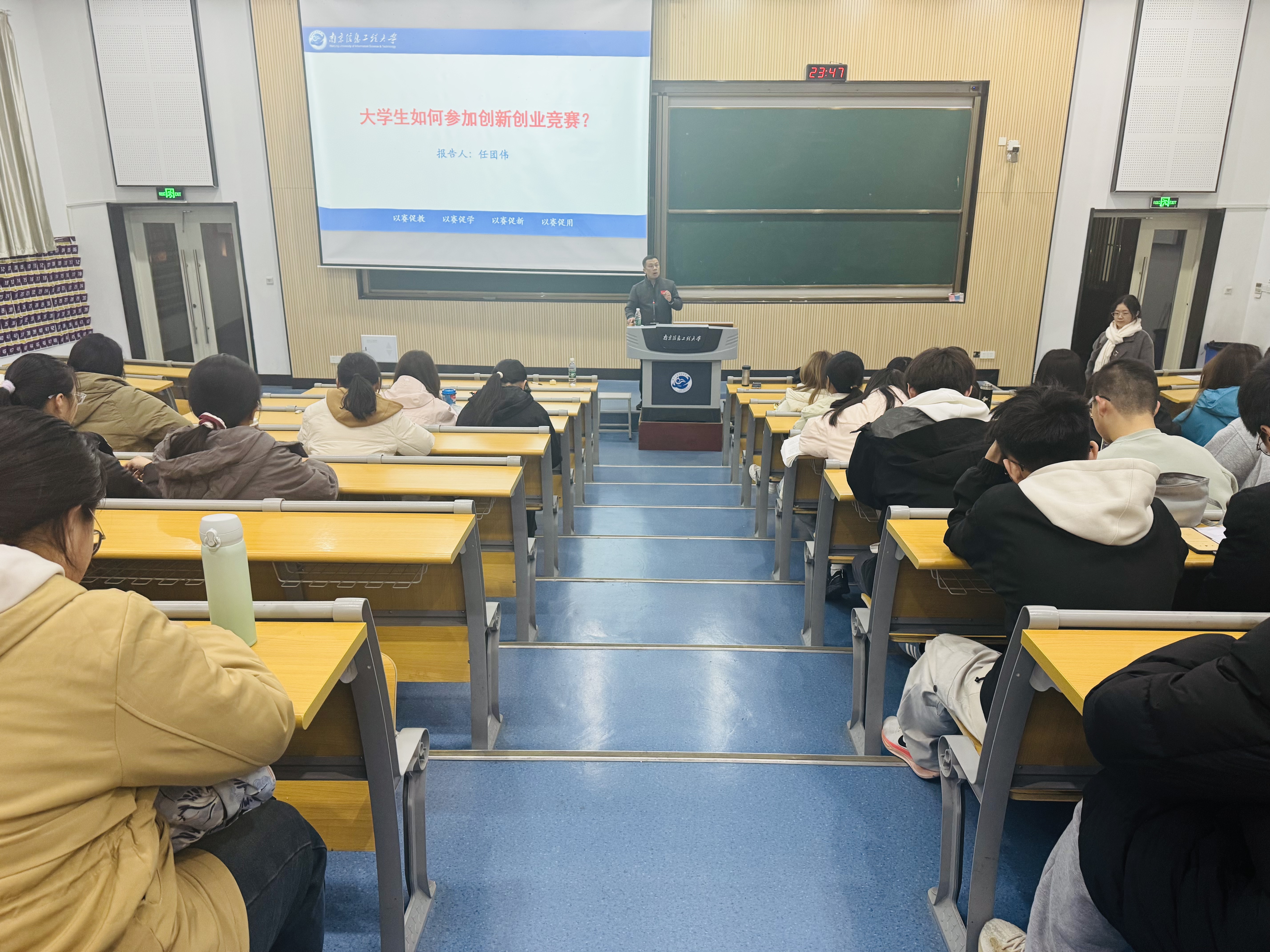 任团伟老师以中国国际大学生创新大赛的宣传片开场,让同学们直观地感受了大学生创新大赛决赛现场的壮观景象,视频观看结束就已经让同学们热血沸腾。接着,任老师围绕大学生应该如何参加创新创业竞赛这一问题,通过长望学院2022级江政轩同学的创新大赛江苏省金奖的成功案例,分享了斩获一类竞赛金奖项目的三大关键:一是,选题要扎根现实,从社会需求切入,避免空泛构想;二是,团队要多元互补,团队成员分工合作、聚力创新;三是,执行要注重落地,通过问卷调研、原型测试验证可行性,材料撰写突出创新性与社会价值。最后,他指出备赛过程比结果更重要——熬夜打磨方案的坚持、答辩时的思维碰撞,都是成长的勋章。希望同学们以“敢闯会创”的姿态,在挑战中书写属于自己的华丽青春!