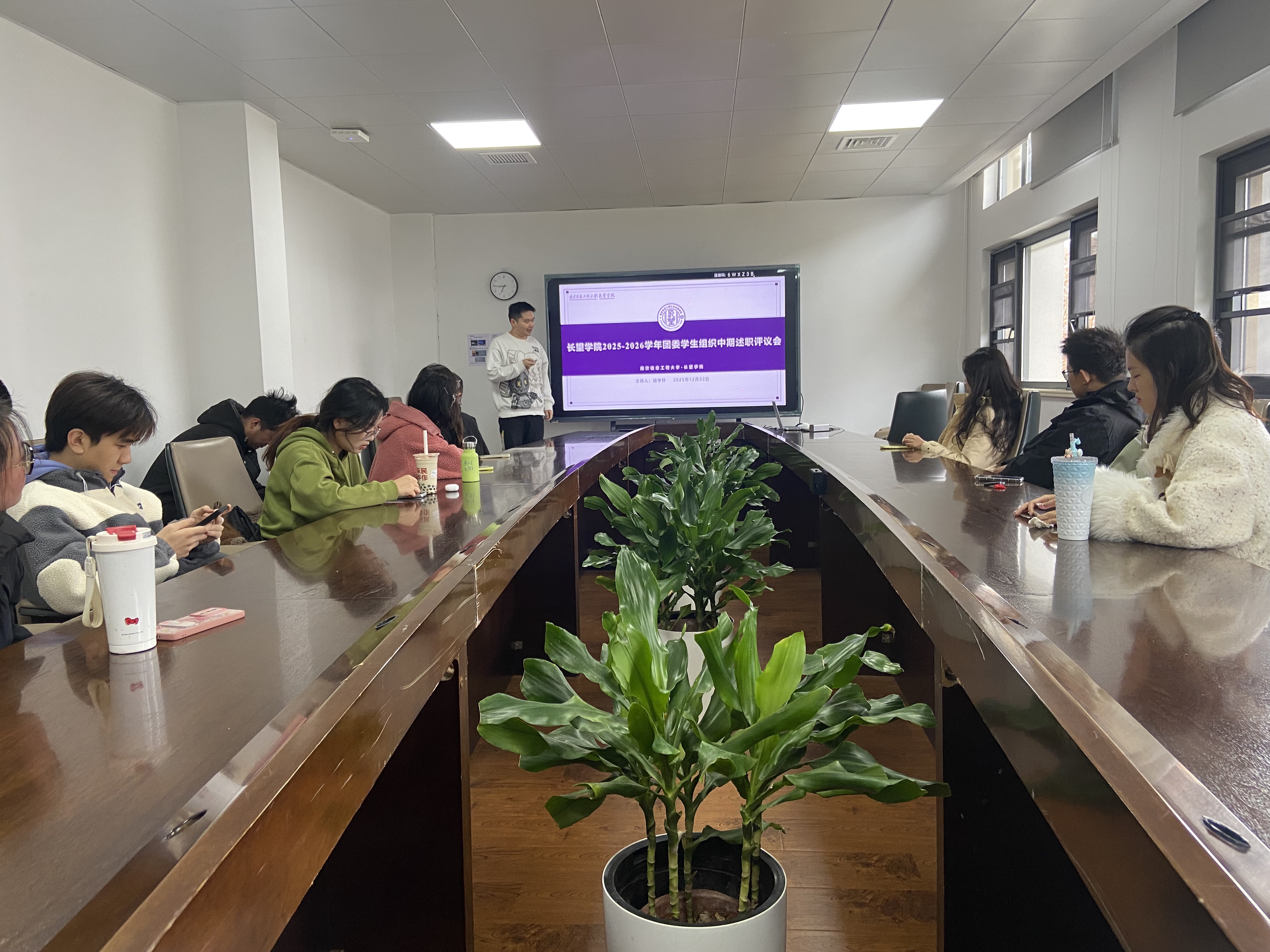 为全面复盘团委学生组织工作成效,精准规划未来工作,长望学院2025-2026学年团委学生组织中期述职于12月22日在理政楼404会议室开展。学院团委书记于阿娜老师出席会议并担任点评嘉宾,青年新闻中心、青年发展部、社会实践部等23个学生部门及社团负责人按既定顺序依次登台述职,各部门成员代表列席参会。
