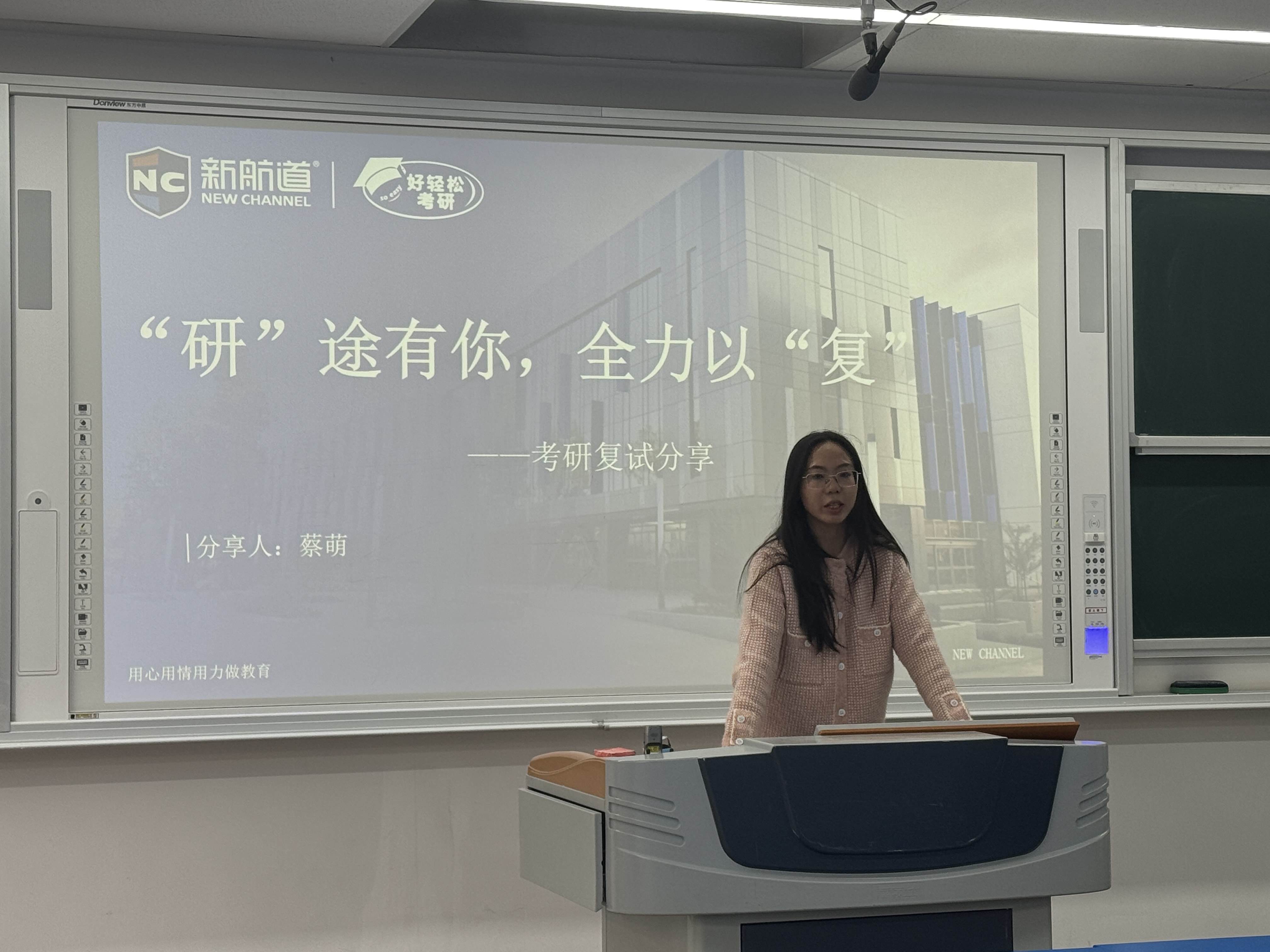 为助力学子精准规划升学路径,提供多元化发展指导,12月22日,我院特邀新航道资深讲师蔡萌、吴逍轩,在明德楼N404教室成功举办“‘研’途有你,全力以‘复’”双主题升学指导讲座。本次讲座聚焦考研复试实战策略与考研后留学规划两大关键领域,旨在为处于升学十字路口的学子们提供清晰、实用的方向指引与策略支持。